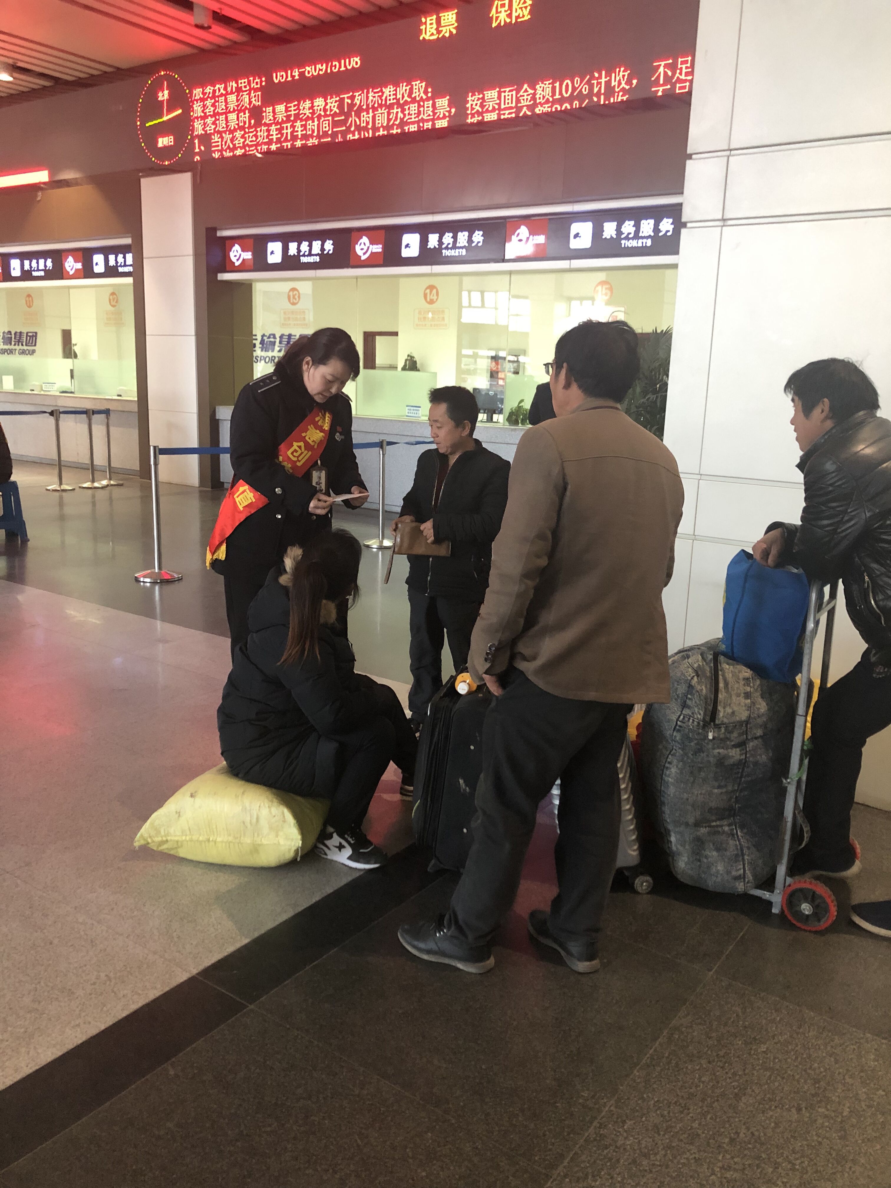 1月27日下午三點,服務班班長尹海霞在現場巡查時發現,售票大廳一角有四個農民工模樣的旅客,望著眼前一大堆行李,說著外地方言,不停地議論著。
