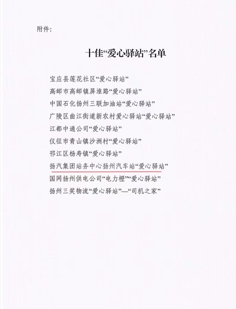 近日,揚(yáng)州市總工會(huì)印發(fā)《關(guān)于命名2022年度十佳“愛心驛站”的通報(bào)》,揚(yáng)汽集團(tuán)站務(wù)中心揚(yáng)州汽車站榮獲十佳“愛心驛站”榮譽(yù)稱號。